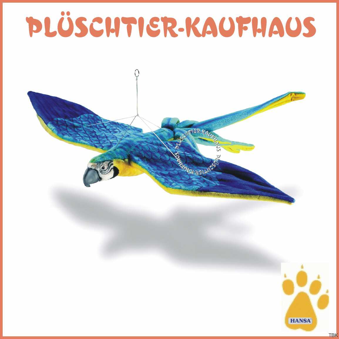 Plüschara in fliegender Position mit Vorrichtung zum Aufhängen.