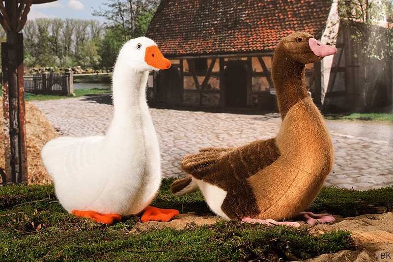Plüschtier Gans oder Plüschtier Graugans in sitzender Position. Das Stofftier Gans ist aus hochwertig verarbeitetem, weißem Plüsch, der Schnabel und die Füße sind orangefarben. Das Kuscheltier Graugans ist aus zweifarbig braunem Plüsch, die Schwanzunterseite ist weiß, Schnabel und Füße sind roséfarben.